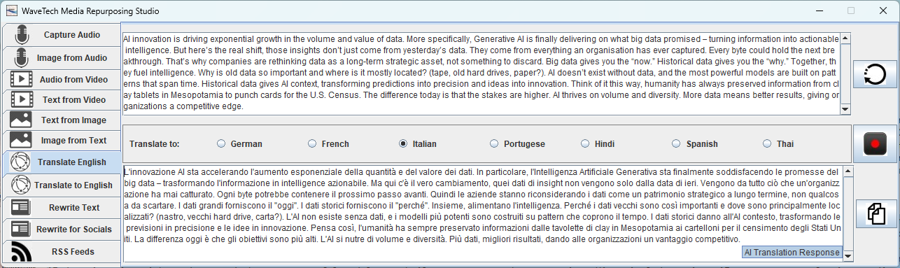 | Global & Local Reach | Reach new markets with support for 56+ languages (including Welsh). Translate audio to English text or convert English content into 7 major world languages. |